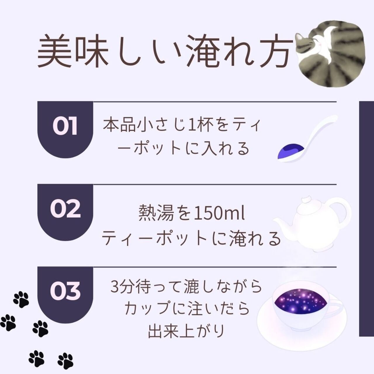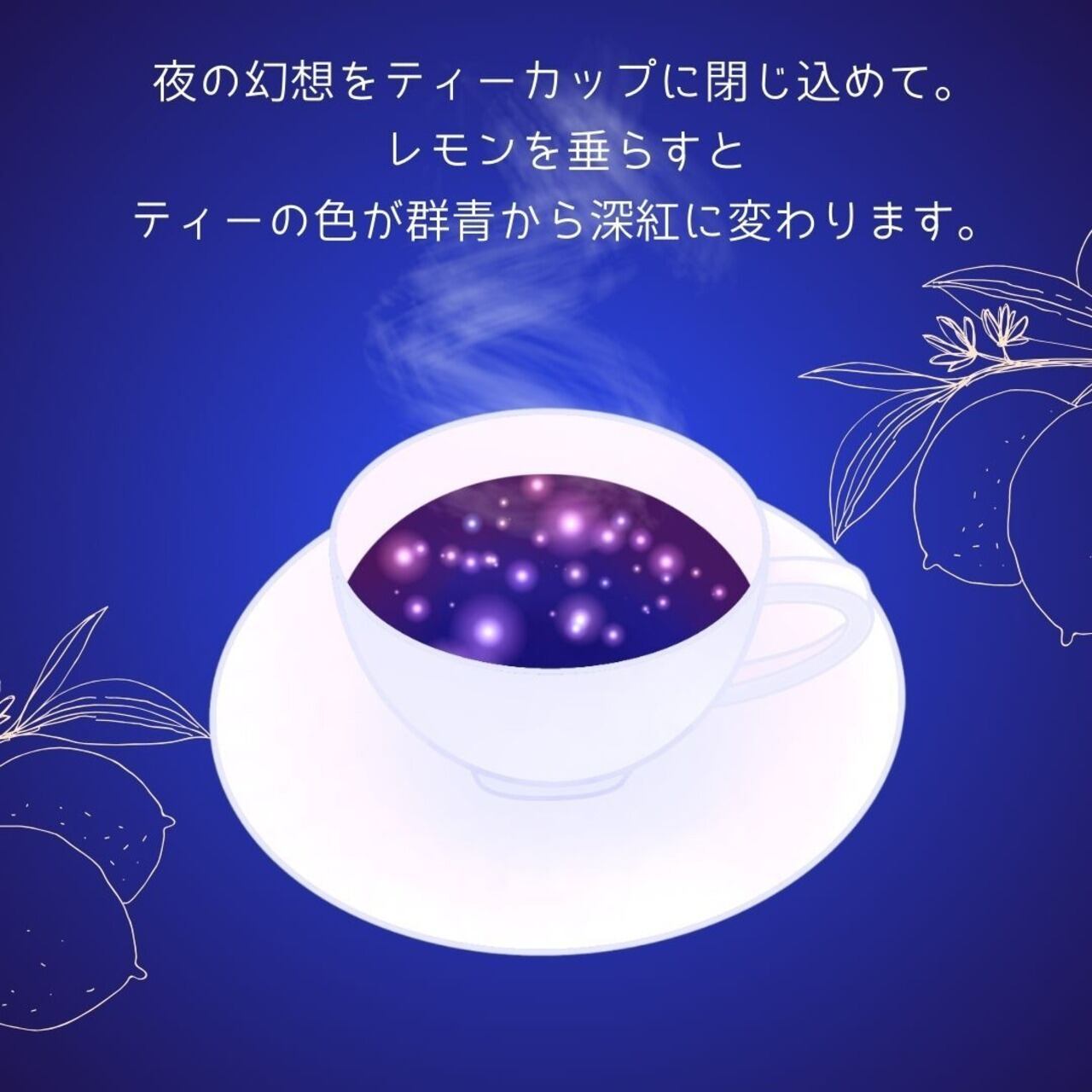 星の輝きや深い夜の静寂を思わせるような群青色を放つ、ファンタジックなハーブティーです。幻想的な味わいと色の変化をお楽しみいただけます。